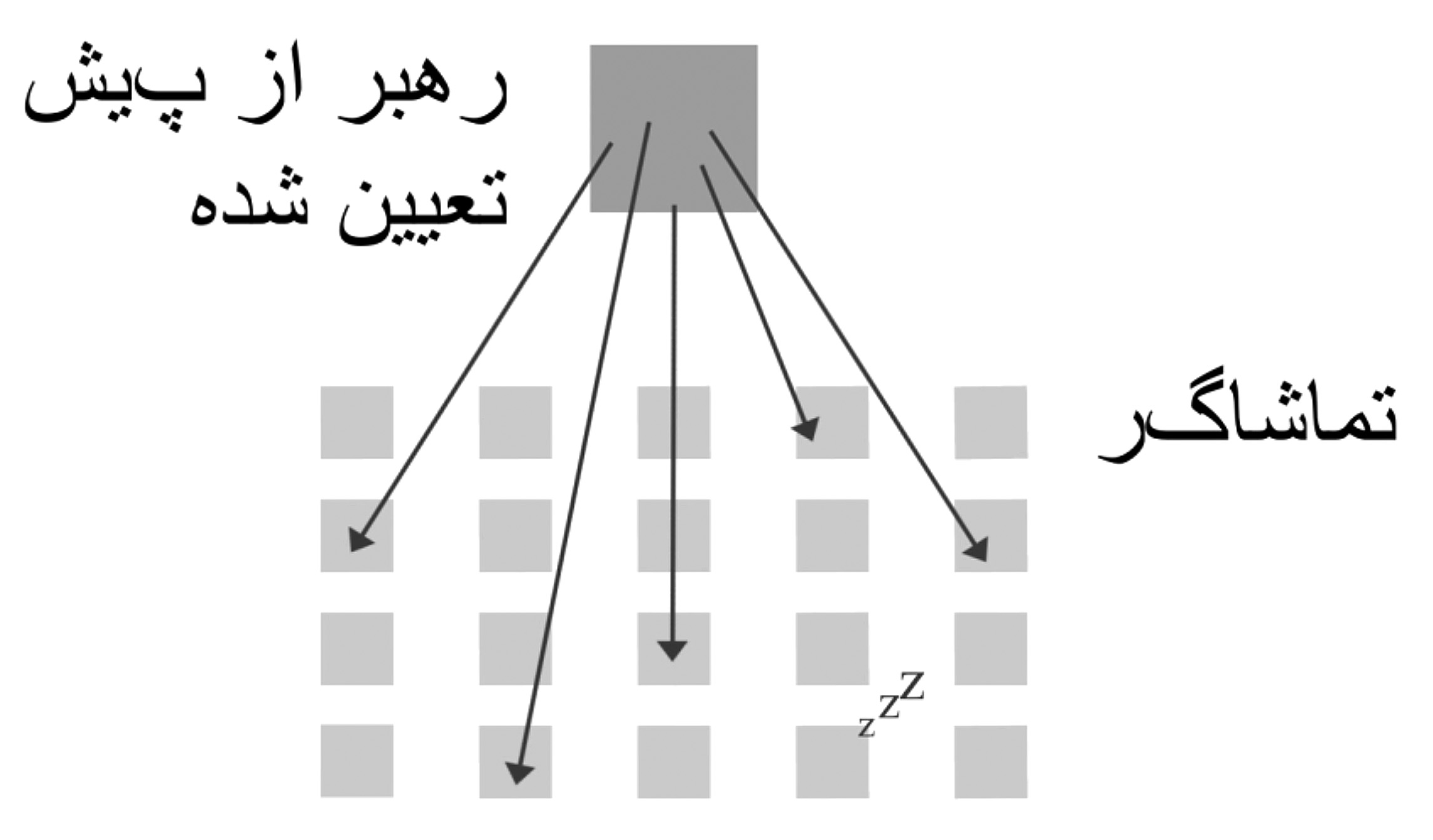 در این مدلی که در مثال زیر مشاهده میکنید، نمونهای از مدلهای مذهبی در مؤسسات و “کلیساهای خانگی”، یک مرد معمولی بهطور رسمی “مسئول آن است که همه چیز باید از نظر او بگذرد. او رسماً شروع میکند، رسماً پایان میدهد، رسماً تدریس میکند یا تعلیمات یا “عبادات” را تعیین میکند. او تصمیم گیری میکند، به سؤالات پاسخ می دهد و “جریان” را کنترل می کند. این متضاد کتاب مقدس است (اول قرنتیان ۱۴: ۲۶) و بسیار کمتر “ثمرده” است. خمیر مایه ای در ظرف، استعدادهای خاموش شده و ربوبیت از دست رفته عیسی در این مدل، تمام ماحصلیست که تضمین شده. همچنین، چنین “روشی” هرگز در کتاب مقدس یافت نمی شود. این باید کاملاً قانع کننده باشد.